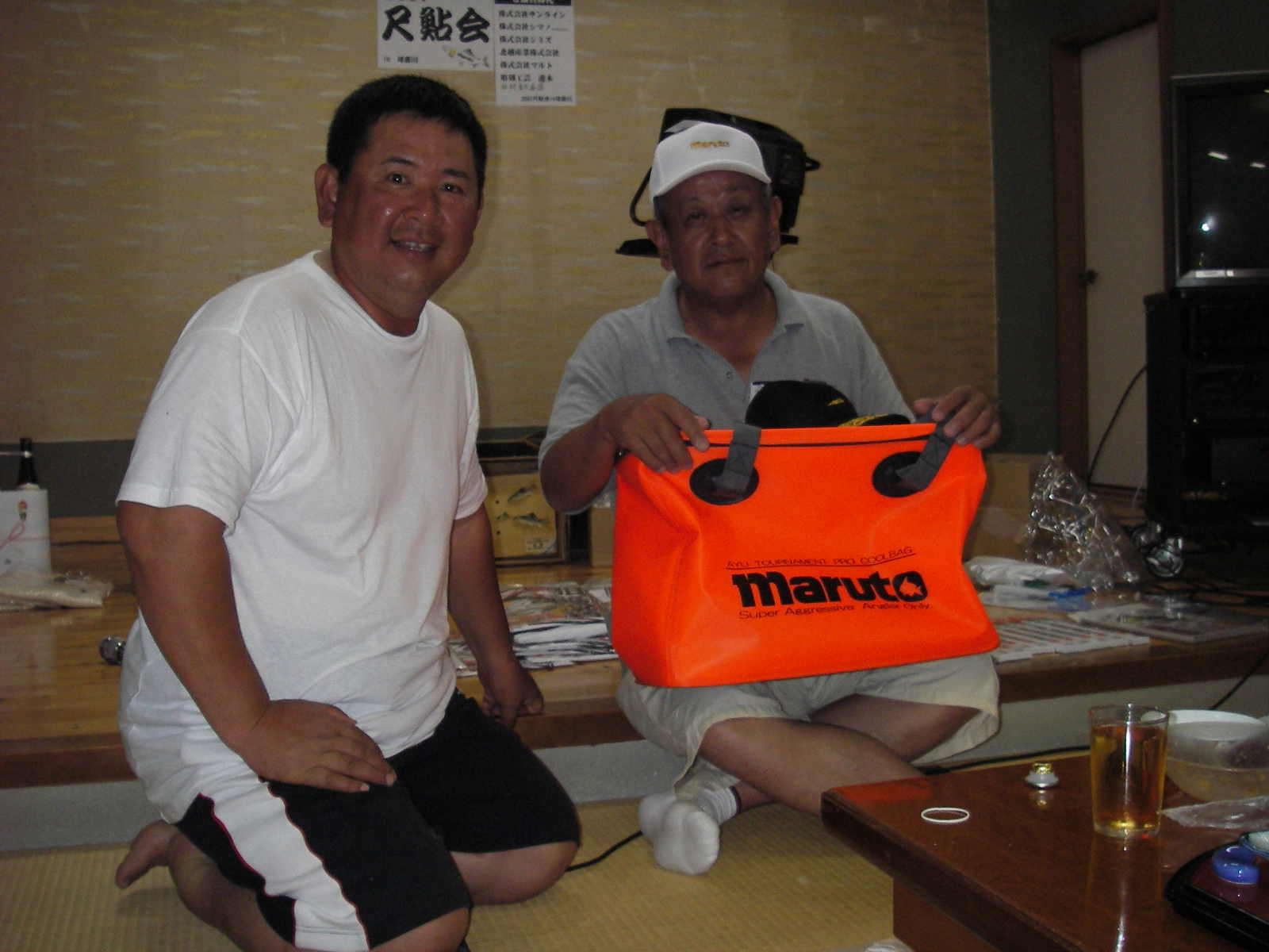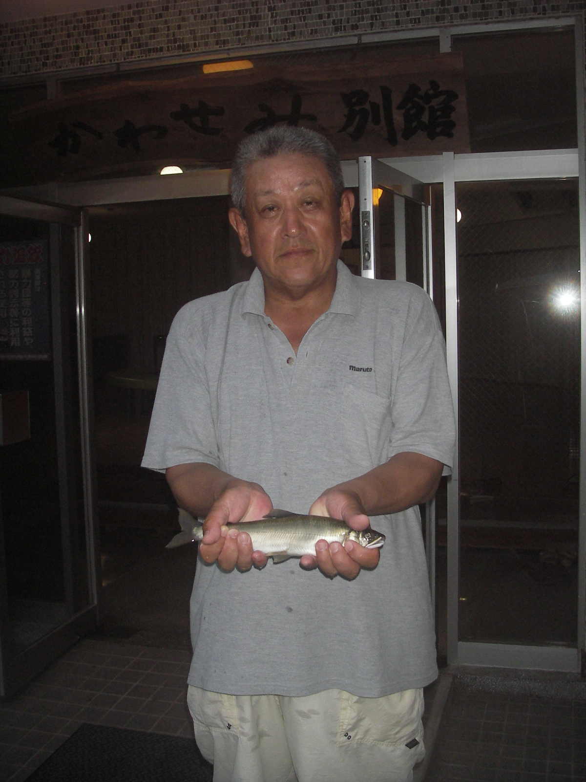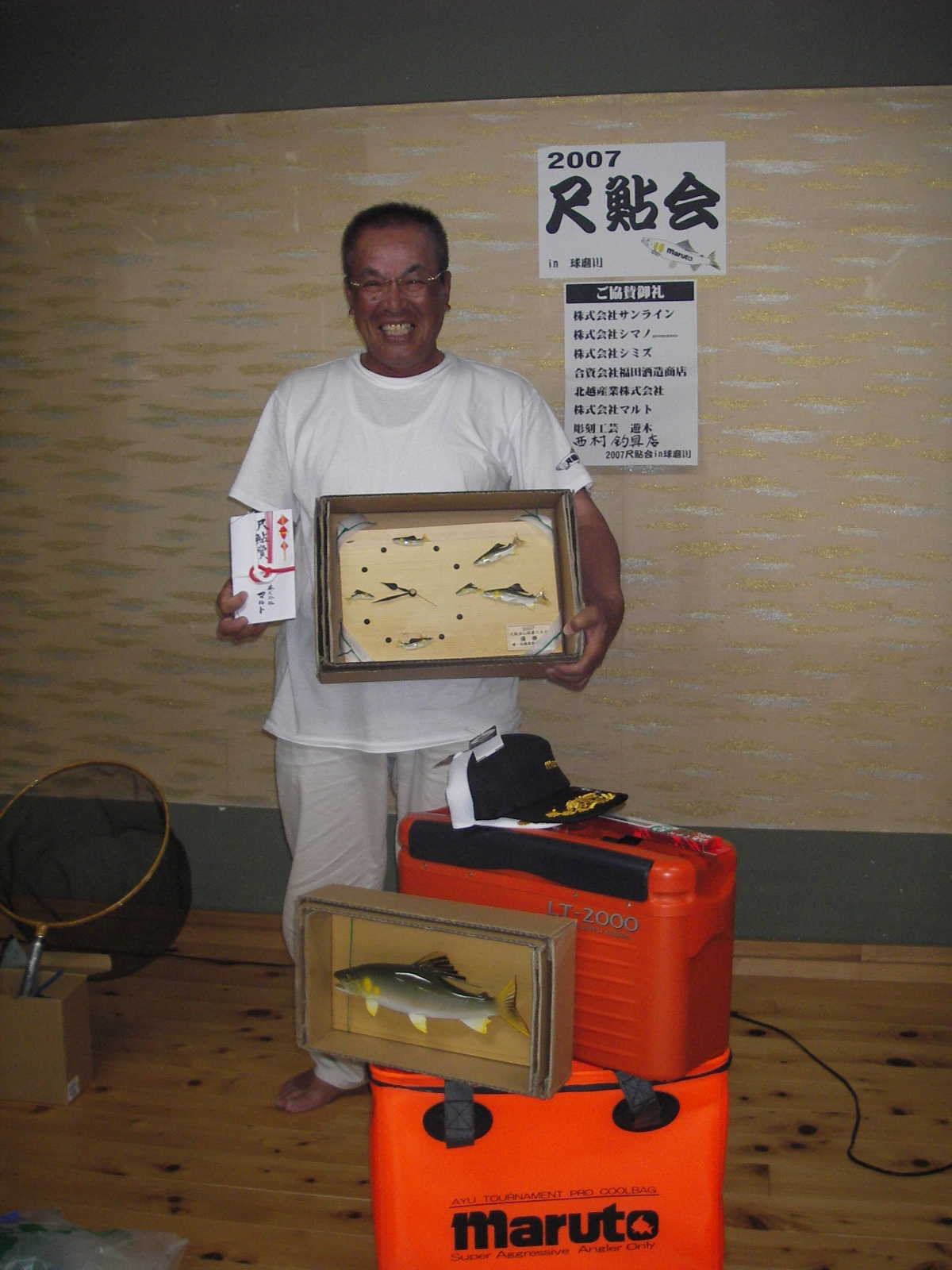 さて、表彰式の後、自己紹介で鮎歴を聞いていると皆さんの経歴は業界の者にとっては頭が下がるものでした。職を全うし、残りの人生を鮎釣りに注ぐ情熱は素晴らしいものがあります。又、優勝した藤井先生から優勝鮎(31cm)の塩焼きを一口づつみんなで突付いて尺鮎の味を楽しみ、明日の大会への情熱を盛り上げて頂きました。